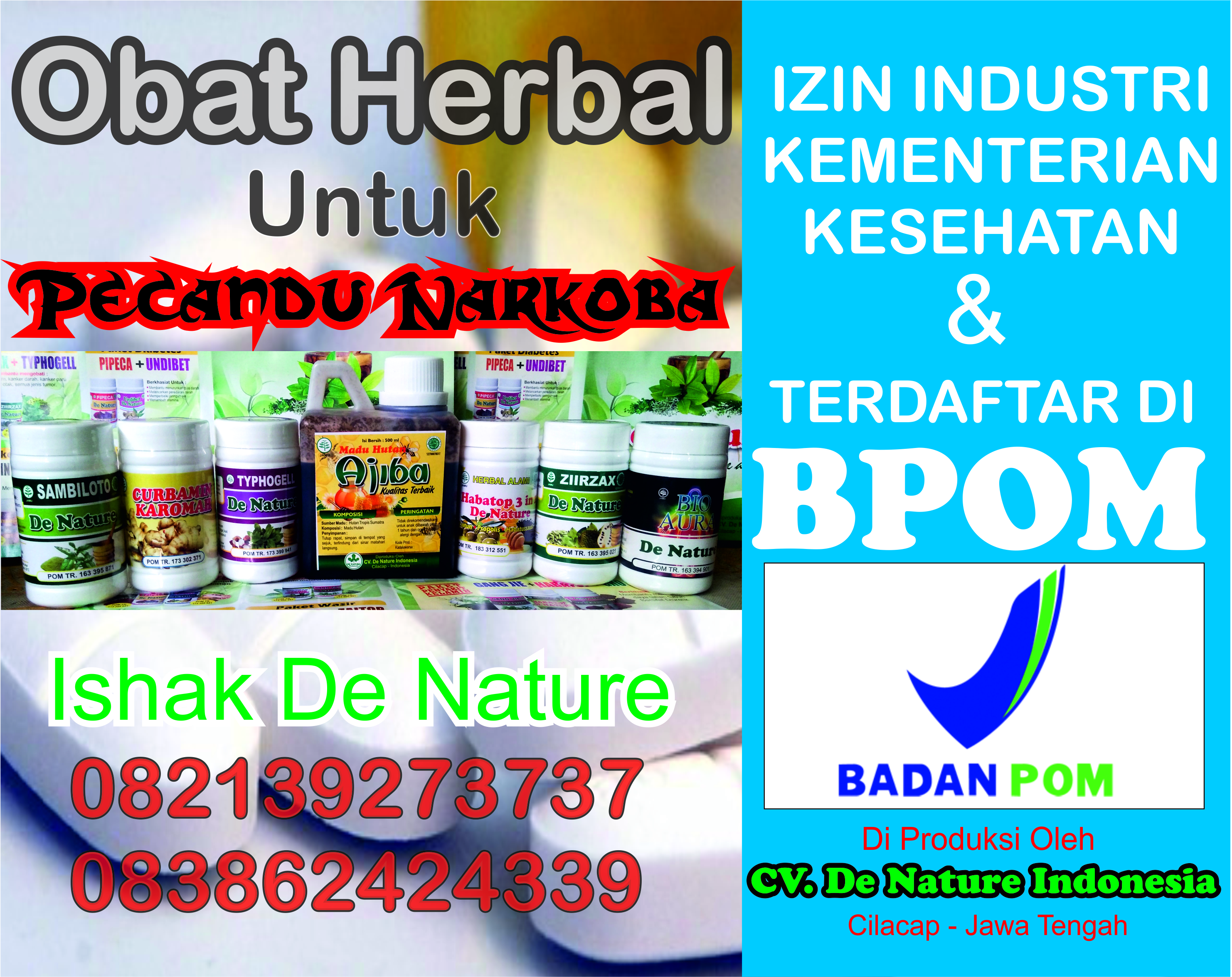 Kami De Nature Indonesia menjual Obat Untuk Pecandu Narkoba yang bisa mengurangi kecanduan narkoba dan bisa memperbaiki sel saraf saraf yang telah rusak akibat bahan kimia yang terkndung dalam Narkoba.